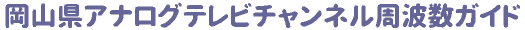 本表に記載されている局名を各放送局の公式発表局名に読み替える場合は以下の様に読み替えてください。 岡山→高松(RNC) 岡山津島→岡山北 岡山牧石→岡山東 岡山福渡→建部南 岡山大井→足守大井(RSK・OHK)・備中大井(NHK) 岡山福谷→備中福谷(RSK・OHK) 岡山高松→備中高松 岡山国ヶ原→御津国ヶ原 倉敷玉島黒崎→倉敷玉島南 倉敷上二万→真備南 玉野用吉→玉野北 備前高田→吉永高田 備前神根→吉永神根 瀬戸内虫明→邑久虫明 赤磐吉井→周匝 赤磐石相→赤坂石相 和気塩田→備前塩田 井原木之子→東井原 井原高屋→西井原 井原稲木→南井原 矢掛→矢掛東 矢掛小田→矢掛西 矢掛山田→矢掛南 井原芳井→備中芳井 高梁川上→備中川上 新見新砥→哲多新砥 真庭河内→落合河内 真庭美川→落合美川 真庭勝山→中国勝山 真庭月田→勝山月田 真庭若代→勝山若代 真庭勝山→中国勝山 津山津山口→津山南 鏡野奥津→奥津大釣(RSK・OHK・TSC・RNC・KSB) 鏡野久田→奥津久田 美作作東→作東江見 美作吉野→作東吉野 美作楢原→美作北 美作勝田→勝田真加部 |
